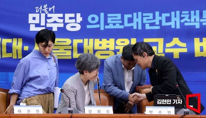 박주민 더불어민주당 의료대란대책특별위원장이 12일 국회에서 열린 서울의대·서울대병원 교수 비상대책위원회 간담회에서 참석자들과 인사하고 있다. 사진=김현민 기자 kimhyun81@