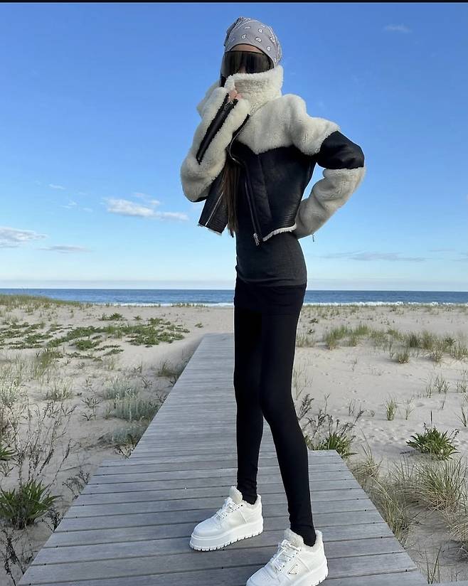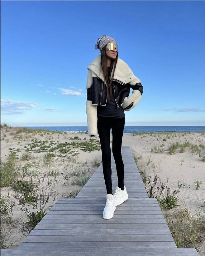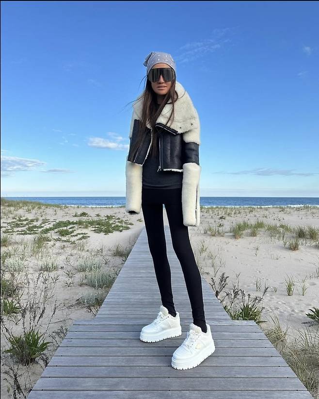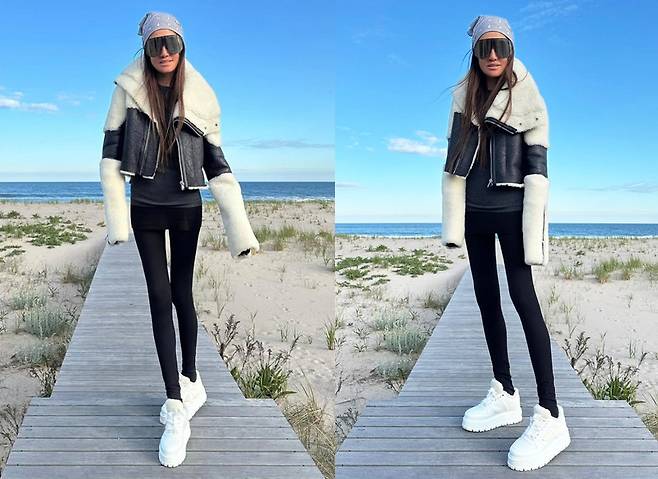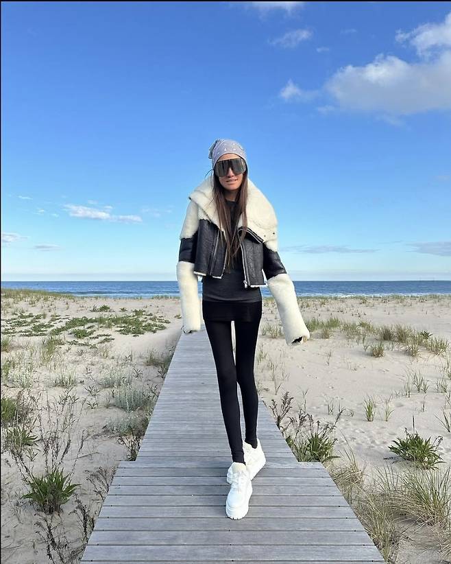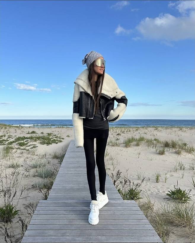 베라 왕은 블랙 레깅스에 화이트 플랫폼 스니커즈를 매치해 슬림한 실루엣을 완벽히 소화했고, 오버사이즈 양털 칼라의 무스탕 재킷으로 겨울 감성까지 절묘하게 끌어올렸습니다.