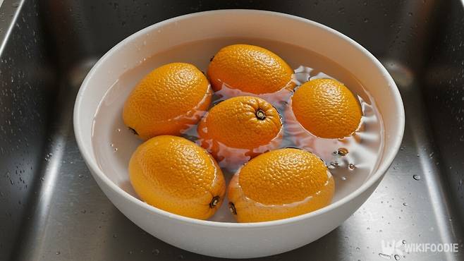 미온수에 베이킹 소다를 풀어준다. 귤과 비슷하게 생긴 과일 껍질에는 오일 성분이 있기 때문에 차가운 물보다는 따뜻한 물에서 세척하는 것이 효과적이다.