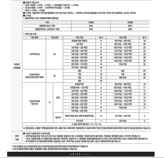 청약 방식은 면적에 따라 가점제와 추첨제가 혼합 적용됩니다. 전용 60㎡ 이하의 경우 가점제 40%, 추첨제 60%이며, 60~85㎡ 이하에서는 가점제 70%, 추첨제 30%입니다. 따라서 추첨제 비중이 높은 소형 평형에 저가점자나 1주택자의 기회가 집중될 것으로 보입니다.