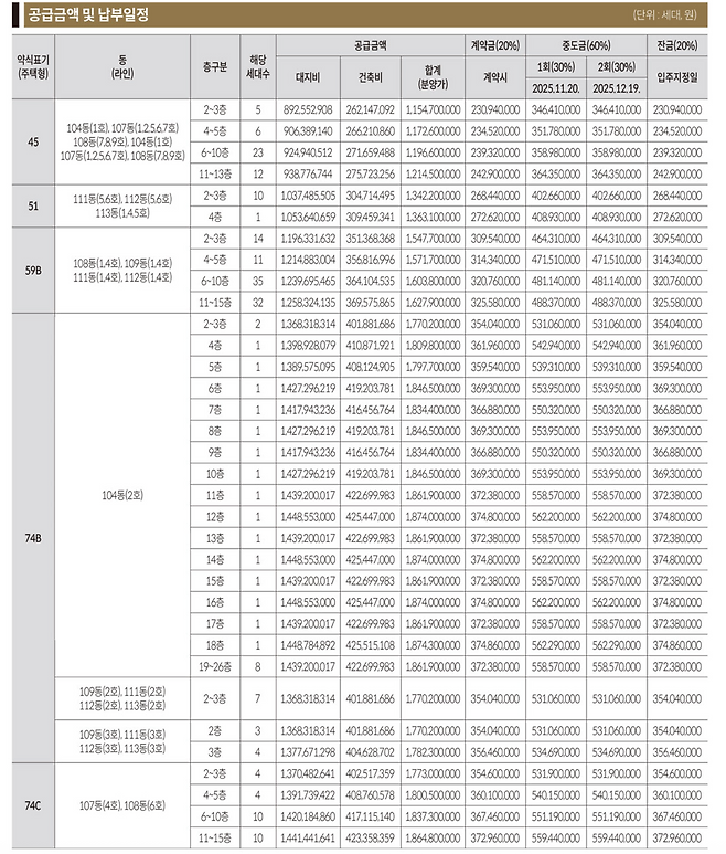 공급 면적은 전용 45㎡, 51㎡, 59㎡B, 74㎡B·C 타입으로, 모두 중소형 평형입니다. 이 중 59㎡B 타입은 전체 일반분양 물량의 42%를 차지하고 있어 상대적으로 당첨 가능성이 높을 것으로 예상됩니다. 분양가는 3.3㎡당 평균 6104만 원으로 확정되었으며, 74㎡ 타입의 경우 약 18.7억 원 수준입니다. 계약금은 분양가의 20%로, 계약 시점에만 3억 원 이상을 준비해야 합니다.