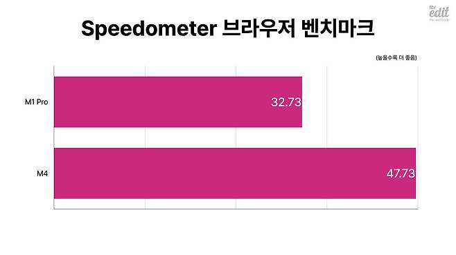 여기서 싱글 코어 성능이 큰 폭으로 앞서는 것이 전반적인 컴퓨터 사용에서 중요한 요소로 작용합니다. 물론 많은 전문가용 앱들은 CPU의 모든 코어들을 활용하지만, 이러한 성능이 크게 필요하지 않은 웹 브라우저나 마이크로소프트 오피스 등을 대표로 하는 생산성 앱들은 대부분 코어 한 개, 많아도 두세 개 정도만 사용하는 경우가 더 많기 때문이죠. 따라서 일반적인 사용 환경에서는 멀티코어 점수보다는 싱글코어 점수의 개선이 더 크게 느껴지게 됩니다. 이 차이를 실감할 수 있는 게 바로 웹 브라우저에서 구동되는 웹 앱의 구동 성능을 테스트하는 스피도미터 벤치마크 결과입니다. M4가 M1 프로와 비교해 1.5배가량의 성능 향상을 보이고 있습니다.