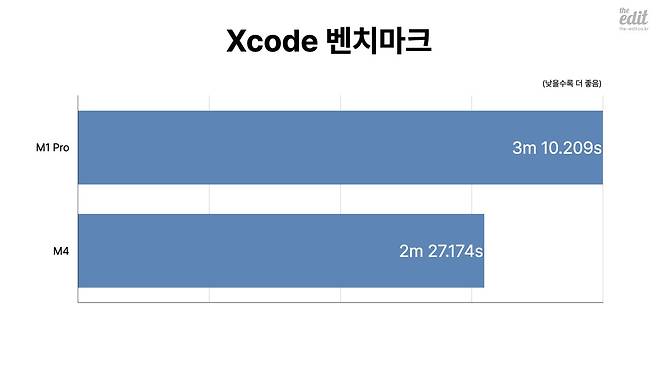 한편, iOS 앱 개발자들이 자주 쓰는 개발 라이브러리를 기반으로 만든 개발 프로젝트를 컴파일(코드를 실행 가능한 앱으로 만드는 과정)하는 테스트인 Xcode 벤치마크에서도 M4가 M1 프로에 비해 1.2배 정도 더 빠른 모습을 보이는데요. Xcode의 컴파일 과정은 가용할 수 있는 모든 CPU 코어를 활용하니 M4의 멀티코어 성능도 M1 프로보다 앞선다는 것을 알 수 있습니다.