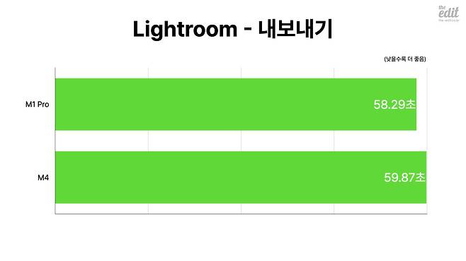 M1 프로가 M4를 앞섰던 경우는 단 하나, 바로 GPU입니다. 특히 CPU와 GPU를 모두 활용하는 라이트룸의 내보내기 테스트에서 여전히 M1 프로가 근소하게나마 M4를 앞섰거든요. 여기서는 프로급 프로세서와 기본형 프로세서의 체급 차이가 어느 정도 실감되는 부분입니다. 하지만 사진의 해상도를 가로세로 각각 두 배씩 업스케일하는 라이트룸의 슈퍼 해상도기능을 같은 사진 파일에 테스트해 본 결과에서는 M4가 앞서는 모습을 보이기도 했습니다.