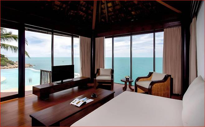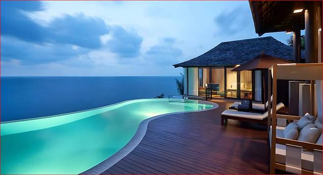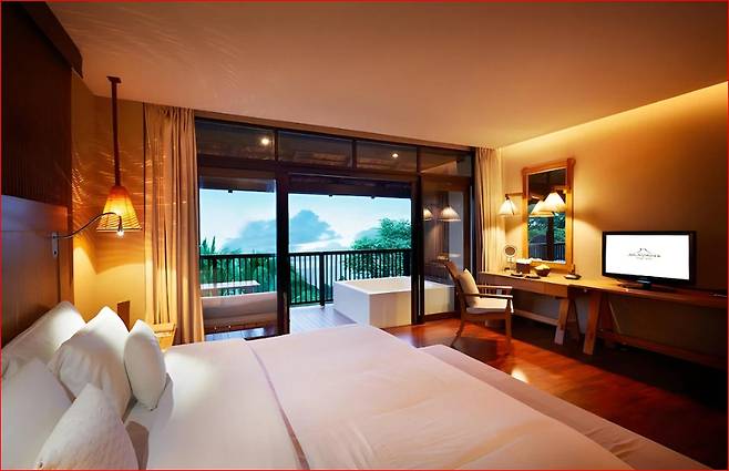 실라바디는 객실 하나하나가 '쉼'이라는 목적에 딱 맞춰져 있어요. 대표적인 풀빌라 객실은 천연 목재와 따뜻한 조명으로 꾸며져 있고, 개인 인피니티풀에서는 바다를 바라보며 언제든지 수영을 즐길 수 있습니다.