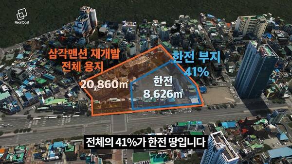 삼각맨션 부지에는 한국전력공사(한전) 부지가 포함돼 있습니다. 전체의 41%가 한전 땅입니다.