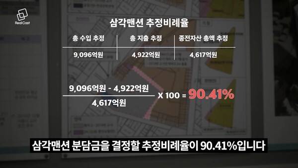 삼각맨션 분담금을 결정할 추정비례율이 90.41%입니다.