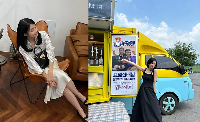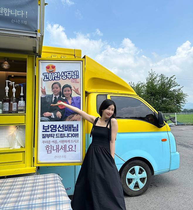 하늘하늘한 블랙 롱 드레스에 리본 스트랩을 더해 로맨틱 무드를 연출하고 있다. 옐로·블루 투톤 푸드트럭 앞에서 톤온톤 대비를 극대화하며, 팔 선을 시원하게 드러낸 슬리브리스 디테일로 한여름 청량감을 배가한다. 자연스러운 A라인 실루엣이 발랄한 제스처와 조화를 이루며 경쾌한 현장감을 전달한다.