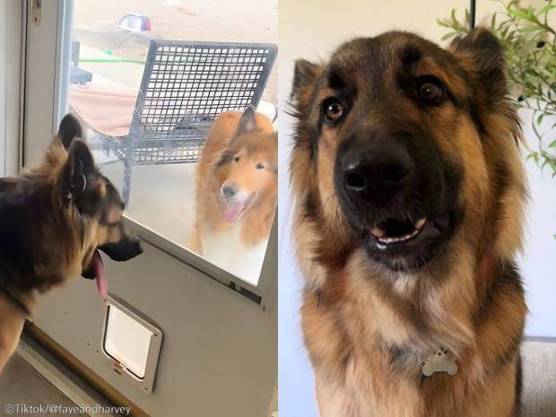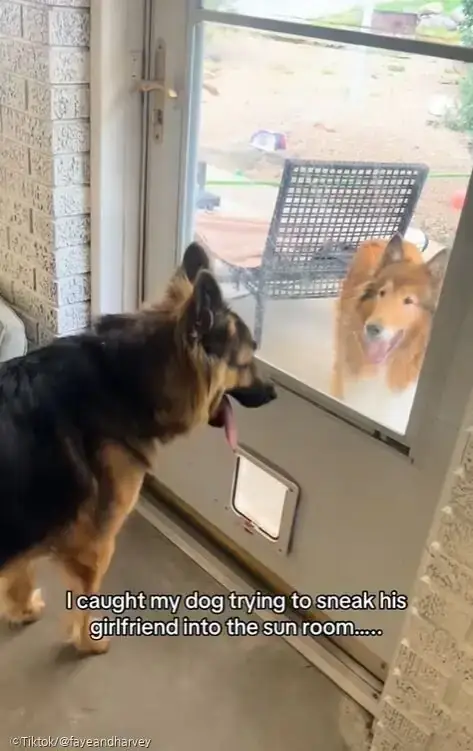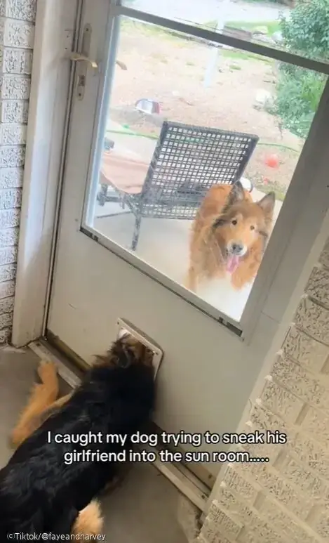 하비는 문 아래에 있는 펫도어(Pet door·반려동물 출입문) 밖으로 머리만 빼놓은 상태로 여자친구와 사랑을 속삭이고 있었습니다.