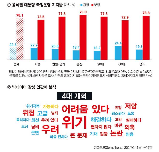 부정평가를 낮추지 못하면 비호감 영향에 따라 4대 개혁과 저출생 대응 전략마저 흔들리고 만다. 4대 개혁에 대한 빅데이터 반응이 어떤지 분석해 보았다. 빅데이터 심층 분석 도구인 썸트렌드(SomeTrend)로 11월1일부터 12일까지 4대 개혁에 대한 빅데이터 감성 연관어를 도출해 보았다. 4대 개혁에 대한 빅데이터 감성 연관어는 '위기' '우려' '저항' '어려움 있다' '위협' '논란' '의혹' '해결하다' '기대' '믿음' '큰 문제' '고급' '실패하다' '우려 있다' '비판' '근면' '편하지 않다' '낭비' '갈등' '최선' '해소하다' '마음 편하다' '도움' '가능하다' '유감' '범죄' '위기극복' '보상' '고민' '독려하다' 등으로 나타났다(그림②). 빅데이터 연관어만 놓고 보면 4대 개혁에 대한 기대감을 거의 찾아보기 힘들다. 정부 부처에서 심도 있는 진척이 있었다고 할지라도 정작 국민에게 제대로 전달되지 않았거나 국민이 4대 개혁에 대해 큰 관심이 없다는 뜻이다. 빅데이터 긍·부정 감성 비율을 보면 긍정 32%, 부정은 67%로 나왔다.