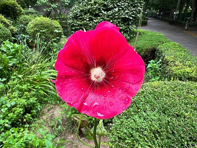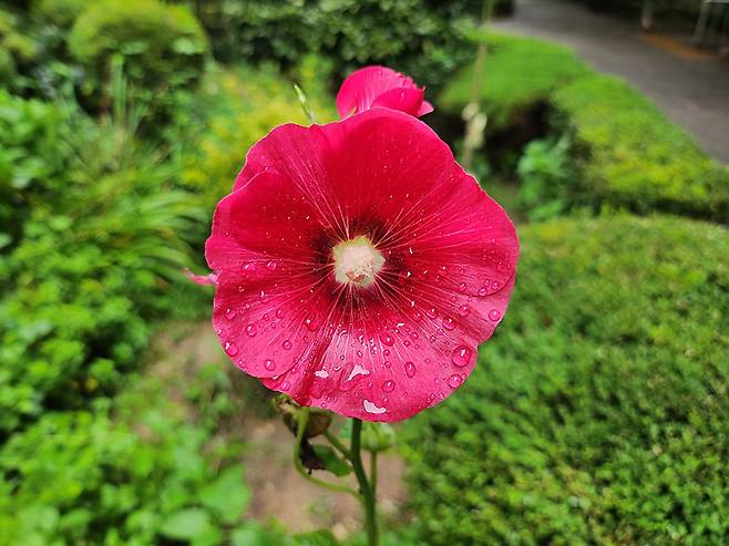 다음 샘플은 강렬한 붉은색의 접시꽃을 촬영한 것으로, 이번에도 갤럭시 Z 플립4는 얕은 심도로 배경이 흐릿하고, 비교대상은 피사체와 배경이 전체적으로 또렷하다. 특이한 점은 비교대상 결과물의 붉은 꽃잎의 가장자리 부분이 과하게 밝게 표현되면서 꽃잎맥의 디테일이 많이 뭉개진 것처럼 보인다. 이런 현상은 이전에는 오히려 갤럭시 시리즈에서 더 심하게 나타났었기 때문에 갤럭시 Z 플립4의 카메라가 이전보다 개선되었다고 볼 수 있겠다.