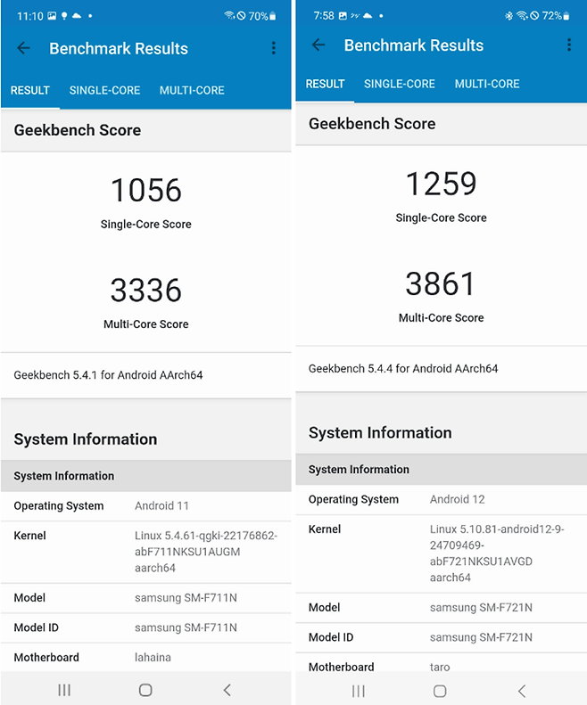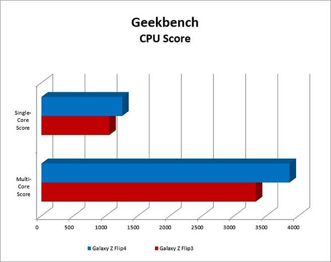 이번에는 갤럭시 Z 플립4의 퍼포먼스를 확인해볼 차례다. 성능의 가늠을 위해 비교대상으로 이전 모델인 갤럭시 Z 플립3의 데이터를 사용했으며, 참고로 갤럭시 Z 플립3는 퀄컴의 스냅드래곤 888 칩셋을 탑재했다. 간단한 성능 확인을 위해 몇몇 벤치마크 앱을 사용했는데, 가장 먼저 Geekbench의 CPU Benxhmark의 결과이다. 갤럭시 Z 플립3는 싱글코어와 멀티코어 점수가 각각 1056점과 3336점을 기록했는데, 갤럭시 Z 플립4는 1259점과 3861점을 기록해 전체적으로 향상된 성능을 보여주고 있다.
