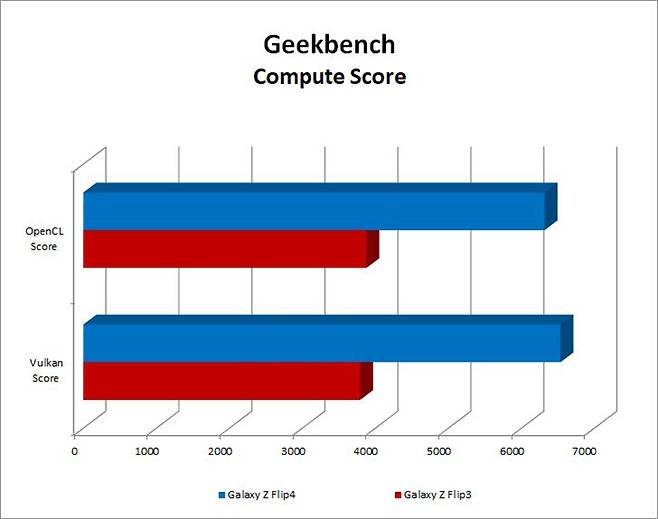 GPU의 성능을 측정하는 Compute Benchmark는 OpenCL과 Vulkan API를 각각 테스트할 수 있는데, OpenCL의 경우 3878점 대 6320점이라는 큰 차이로 갤럭시 Z 플립4가 앞서고 있으며, Vulkan의 경우도 3792점 대 6537점으로 갤럭시 Z 플립4가 크게 앞서고 있다. 갤럭시 Z 플립3의 GPU는 아드레노 660이고, 갤럭시 Z 플립4는 아드레노 730이 탑재되어 GPU 성능 향상의 폭이 큰 것으로 보인다.
