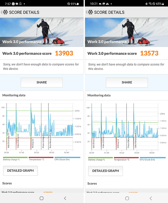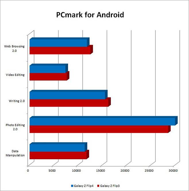 마지막으로 시스템의 전체적인 성능을 확인하기 위해 PCmark for Android를 실행했다. 웹 브라우징과 동영상 편집, 문서 작성, 사진 편집 등 다양한 실제 사용 환경을 시뮬레이션한 테스트가 진행되는데, 총점 13903점 대 13573점으로 갤럭시 Z 플립4가 오히려 약간 낮은 점수를 기록했다. 세부 항목을 보면 사진 편집 항목에서만 갤럭시 Z 플립4가 앞서고, 나머지 항목에서는 갤럭시 Z 플립3가 오히려 조금씩 앞서고 있다. 테스트에 사용된 단말기가 시판용이 아니라 샘플기기이기 때문에 최적화가 덜 이루어져 있을 수도 있고 결과 자체도 오차범위를 감안하면 거의 비슷한 수준이지만, 향상된 프로세서에 비해 다소 아쉬운 결과로 볼 수도 있겠다.