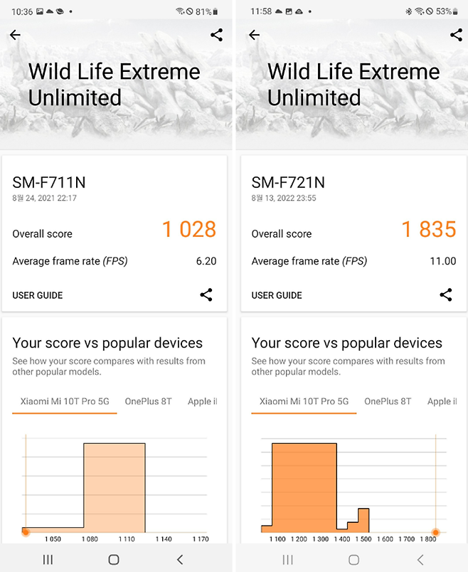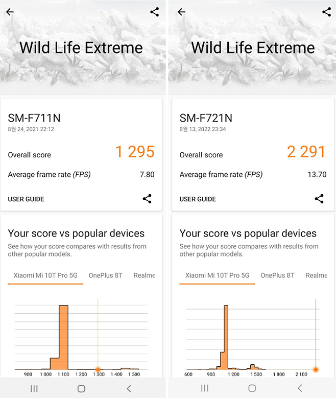 이번에는 3D 그래픽 성능을 확인할 수 있는 3D Mark의 Wilde Life Extreme과 Off screen으로 테스트를 진행하는 Wild Life Extreme Unlimited를 실행해보았다. 결과는 1295점 대 2291점, 1028점 대 1835점으로 갤럭시 Z 플립4가 모두 앞서 Geekbench의 Compute Benchmark와 비슷한 양상을 보여주었다.