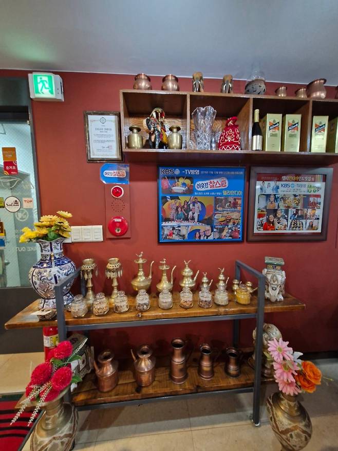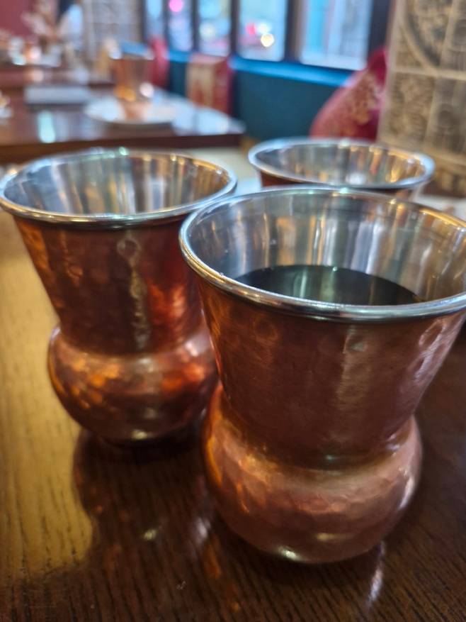 일단 자리에 앉자 물컵과 생수병을 가져온다. 물컵이 참 인도스럽다. 입구 양쪽 벽으로는 TV에 방영된 자료 화면과 각종 인도 장식품들이 진열되어 인도의 느낌을 전달해준다. 메뉴판을 보니 세트 메뉴가 가장 먼저 보이는데 우린 단품으로 따로 주문하기로 했다. 가격은 그리 비싸지 않은 편이다. 둘이 와서 3만원 정도면 충분하다. 우린 탄두리 치킨에 커리 2가지, 난 2개를 주문해서 5만원 정도 나왔다. 세트 메뉴 시켰을 때와 크게 다르지 않다.