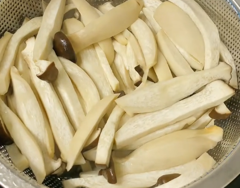 새송이버섯은 먹기 좋게 썰어 끓는 물에 6분간 찐 후 찬물에 헹궈 식혀주세요.👉 이렇게 하면 볶을 때 물이 안 생기고 식감이 쫄깃해져요!