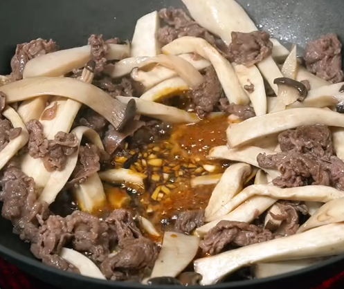 고기가 익으면 쪄놓은 버섯을 넣고 함께 볶기