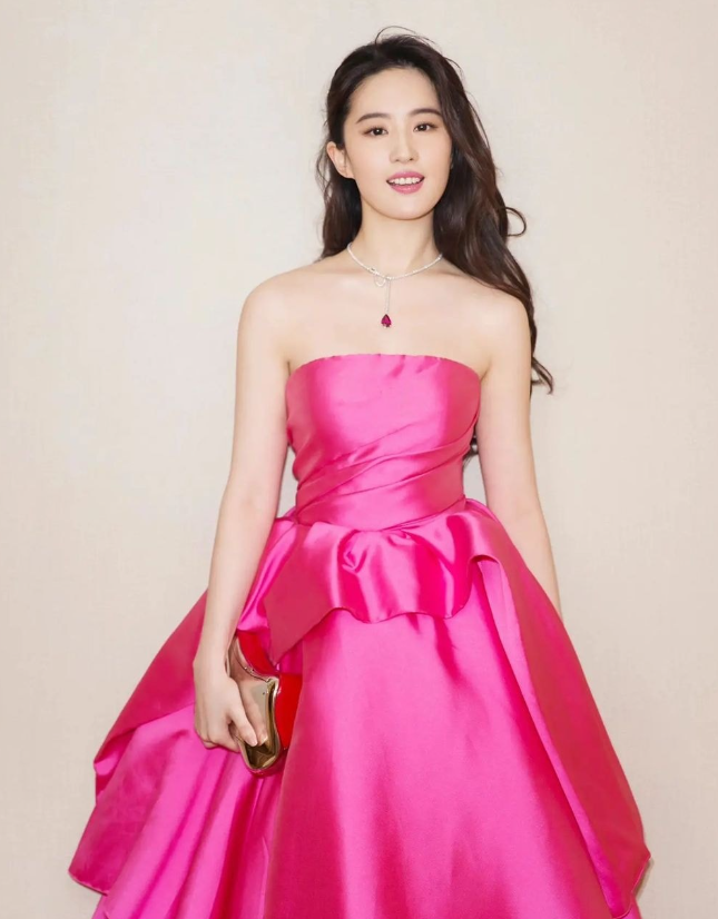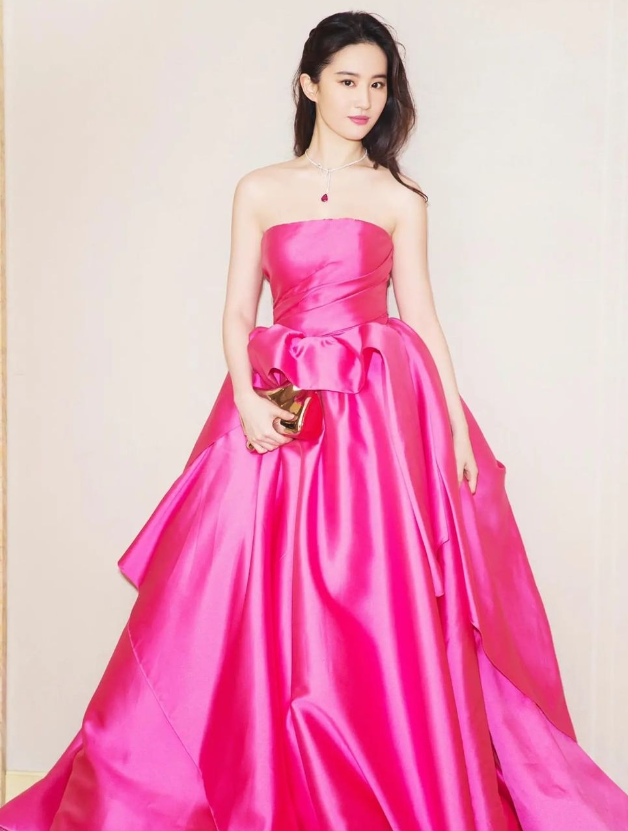 유역비는 웨이브진 헤어를 늘어뜨리고 백옥피부를 돋보이게 하는 핑크색 실크 드레스로 시선을 사로잡았습니다.