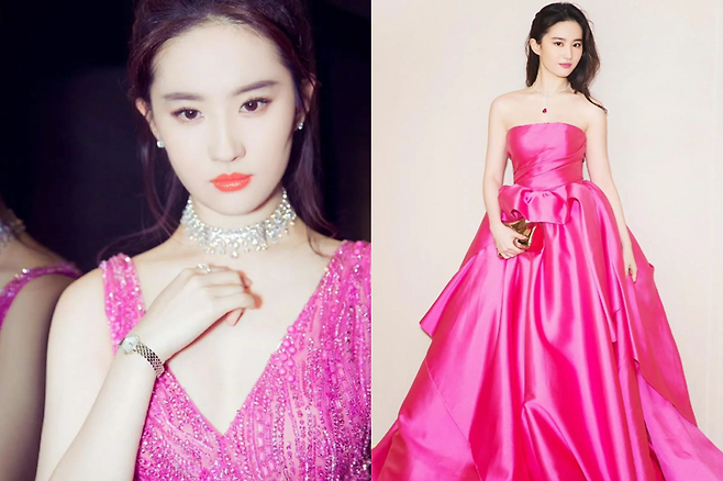 유역비는 핫핑크 드레스에 목걸이를 매치해 청순하면서 고급스러운 드레스룩을 완성했습니다.