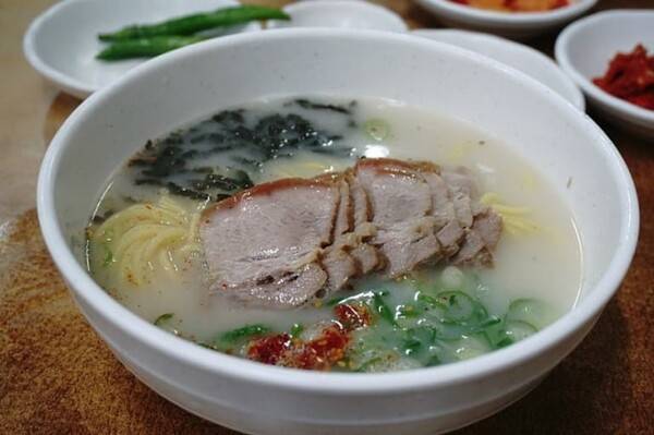 고기국수는 돼지고기를 삶은 국물에 면을 말아 먹는 음식이에요. 고소한 국물과 쫄깃한 면발의 조화가 일품이죠.