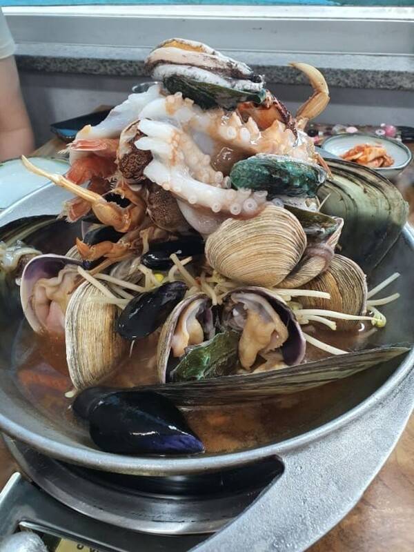 이곳의 특징은 해물탕에 흑돼지를 넣어 먹는다는 점이에요. 짭조름한 해산물과 고소한 흑돼지의 조화가 일품이죠.