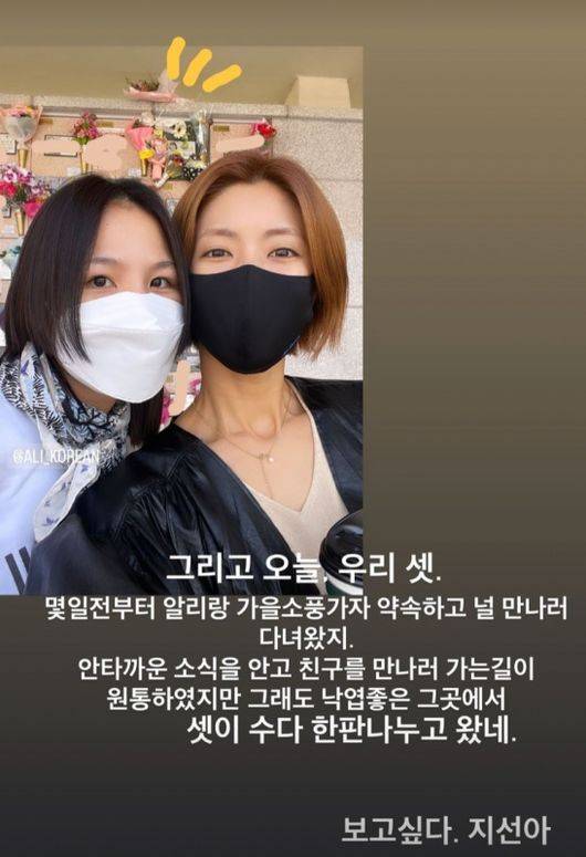 이윤지는 "오늘, 우리 셋. 몇일 전부터 알리랑 가을 소풍 가자 약속하고 널 만나러 다녀왔지. 안타까운 소식을 안고 친구를 만나러 가는 길이 원통했지만 그래도 낙엽 좋은 그 곳에서 셋이 수다 한판 나누고 왔네”라며 "보고싶다. 지선아”라고 그리운 마음을 전했다. /mk3244@osen.co.kr