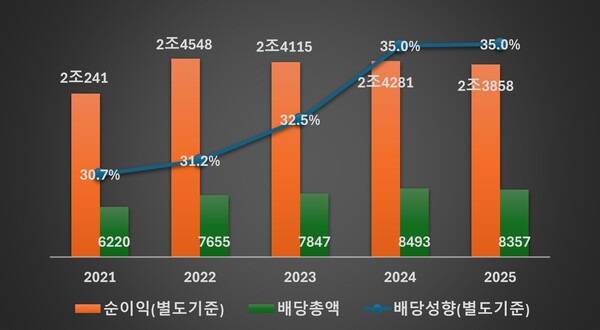 기업은행이 이 요건을 충족하려면 총배당금이 최소 약 9342억원, 주당배당금은 약 1172원 수준까지 올라가야 했다. 그러나 이번 결산배당안은 총 8357억원, 주당 1048원에 그쳤다. 별도 기준 배당성향은 약 35%에 머물렀고, 현금배당 총액도 전년(8493억원)보다 1.6% 감소했다.