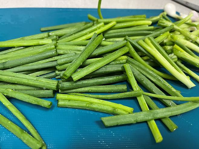 쪽파는 깨끗하게 세척한 후 4~5cm 간격으로 숭덩숭덩 썰어 주세요.