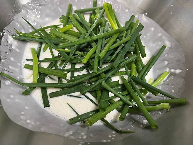 저는 튀김가루만 사용했는데요. 튀김가루로 전을 부치면 바삭한 식감을 더 잘 살릴 수 있습니다. 종이컵 기준 튀김가루 반 컵, 물 반 컵 넣어서 반죽을 만드세요.