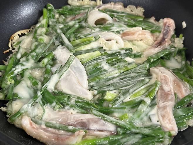 튀김가루 반죽에 쪽파, 새우, 오징어 등 재료를 모두 넣고 섞어 줍니다. 참고로 튀김가루 반죽은 너무 오래 젓거나 뒤적이면 점성이 생겨요. 그러면 구웠을 때 바삭함이 떨어지므로 많이 휘젓지 마세요!