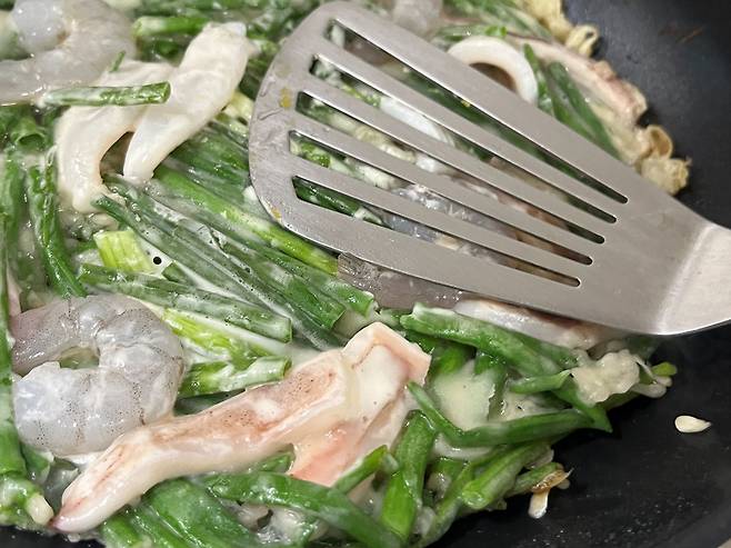 그리고 전을 굽는 시간을 오래 하지 마세요! 해물만 어느 정도 익으면 되기 때문에 빠르게 부쳐냅니다. 약불보다는 중불로 익히시고요. 뒤집개로 꾹꾹 누르면 전이 떨어지지 않고 바삭하게 익어요.