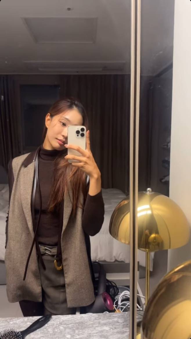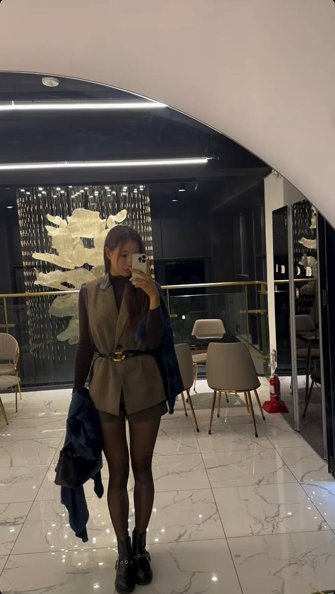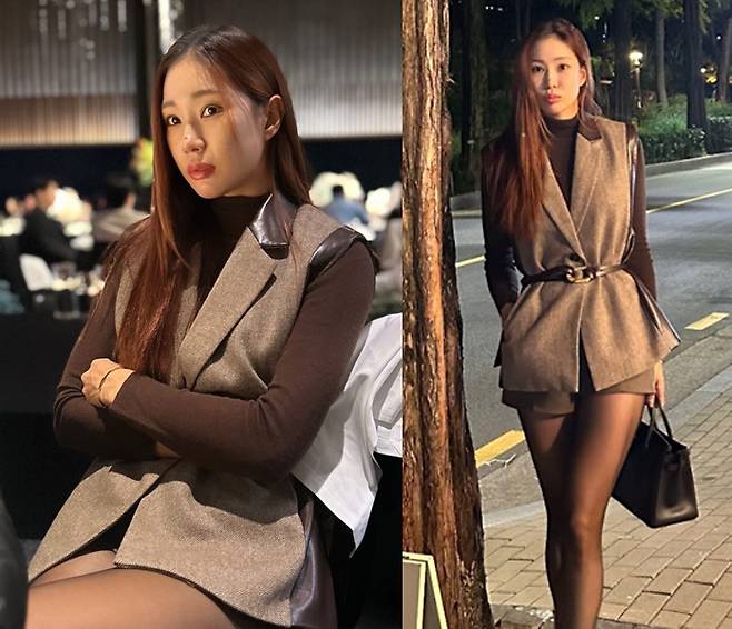 브라운 톤의 터틀넥과 베스트를 매치한 유현주는 벨트로 허리선을 강조해 슬림한 실루엣을 완성했습니다.