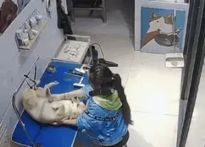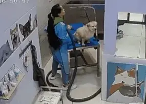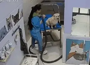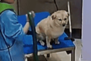 목욕 후에 강아지가 얌전히 자리 잡고 있는 순간, 미용사 언니가 갑자기 ‘뽀뽀’를 해버렸다고 하네요.
