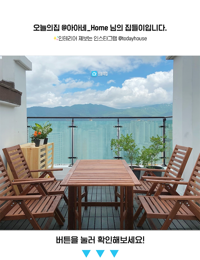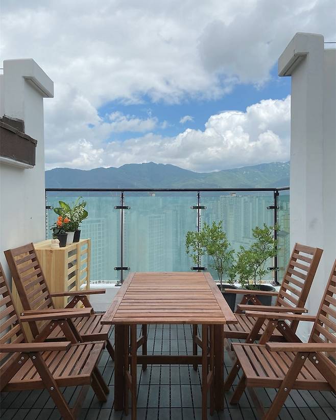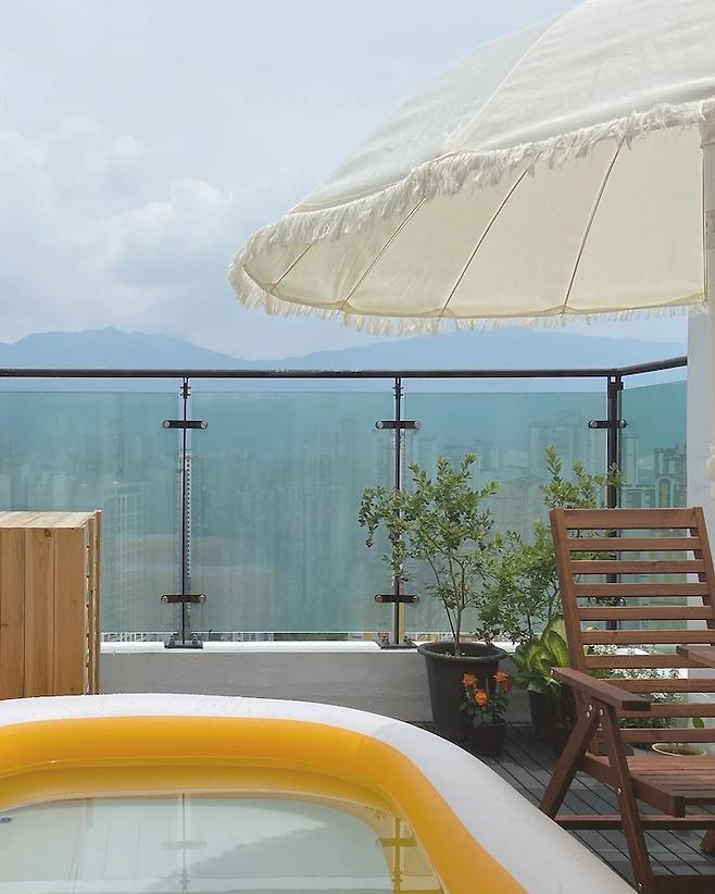 남편이 제일 원하던 공간이에요. 4~5평 정도 크기의 테라스입니다. 이곳에서 즐겁게 물놀이도 하고, 고기도 구워 먹고, 배달 음식도 시켜 먹고, 블루베리와 식물들을 키우면서 힐링하고 있답니다.