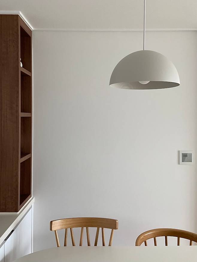 주방에서 우드 포인트 장식장도 마음에 들지만, 식탁 조명이 있어서 주방 인테리어가 더더욱 매력적이에요. 겉으로 보기엔 흔한 디자인일 수 있지만 안에 웨이브가 너무 예쁜 조명이랍니다.