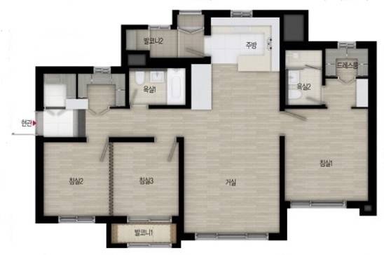 우리 집은 1층은 25평 일반 아파트 구조와 같고요. 2층은 테라스 포함 20평 정도 되는 것 같아요.
