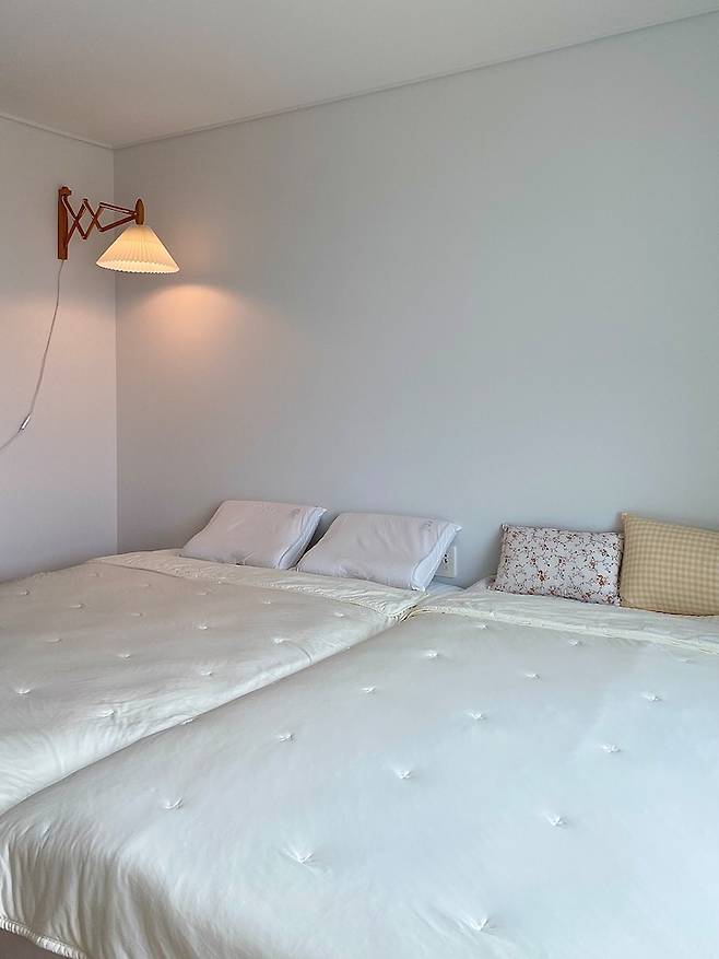 침실은 아이들과 함께 자야 해서, 원목 깔판에 킹 매트리스 두 개를 놓고 사용해요.