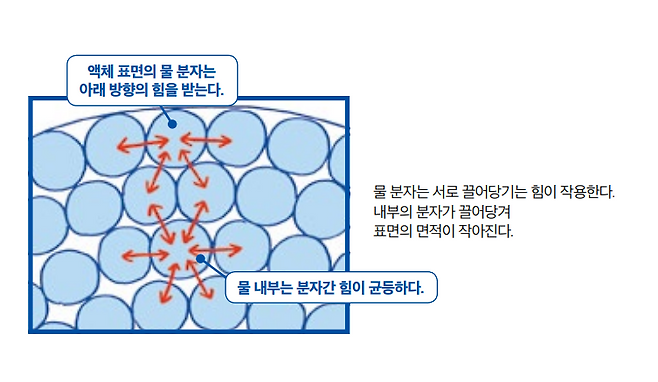 액체는 형태를 자유롭게 바꿀 수 있지만 어느 정도 뭉치려는 성질이 있습니다. 각 물질의 분자들이 서로 끌어당기는 ‘분자 간 힘’을 가지고 있기 때문입니다. 유체처럼 움직이는 물질은 분자 간 힘이 표면의 면적을 되도록 작게 만들려는 방향으로 작용하는데, 이 힘을 계면 장력이라고 합니다. 액체일 때는 표면 장력이라고 합니다. 물은 액체 중에서도 표면 장력이 큽니다.
