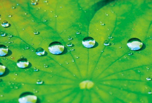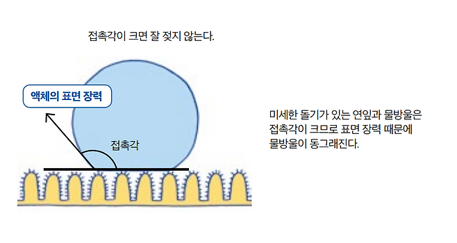 표면이 울퉁불퉁한 잎이 물을 튕겨 내고, 표면 장력에 의해 물방울이 동그래집니다. 연잎에 맺힌 물방울을 생각해 봅시다. 연잎 표면에는 많은 미세한 돌기가 있어 연잎 위의 물방울은 돌기 위에 떠 이는 형태가 됩니다. 이로 인해 표면에 접촉하는 면적이 아주 작아지면서 표면 장력이 커집니다. 또 돌기와 물방울의 접촉각이 크므로 표면 장력 때문에 동그란 물방울을 만듭니다.