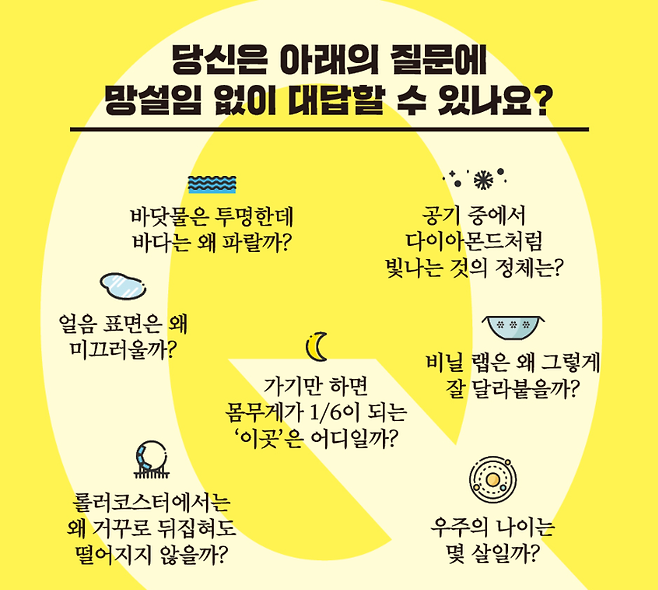 사소한 일 하나에도 다 이유가 있듯이 물방울이 둥근 모양을 유지하고 있는 데에도 중요한 이유가 있습니다. 물리는 일상 속 궁금증에 명쾌한 답변을 줍니다. 알고 보면 물방울이 나뭇잎 위를 굴러다니는 데도, 나뭇잎이 팔랑팔랑 떨어지는 것에도, 세상 모든 색을 보게 해주는 빛 등에도 물리학의 원리가 존재합니다. 여러분은 아래의 여러 가지 물리에 관한 상식 중, 몇 가지나 알고 계신가요?