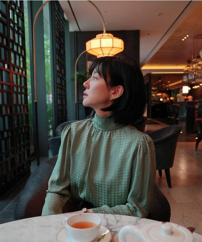 임수정은 높은 네크라인과 퍼프소매가 특징인 고급스러운 녹색 블라우스를 착용해 우아한 느낌을 주었습니다.
