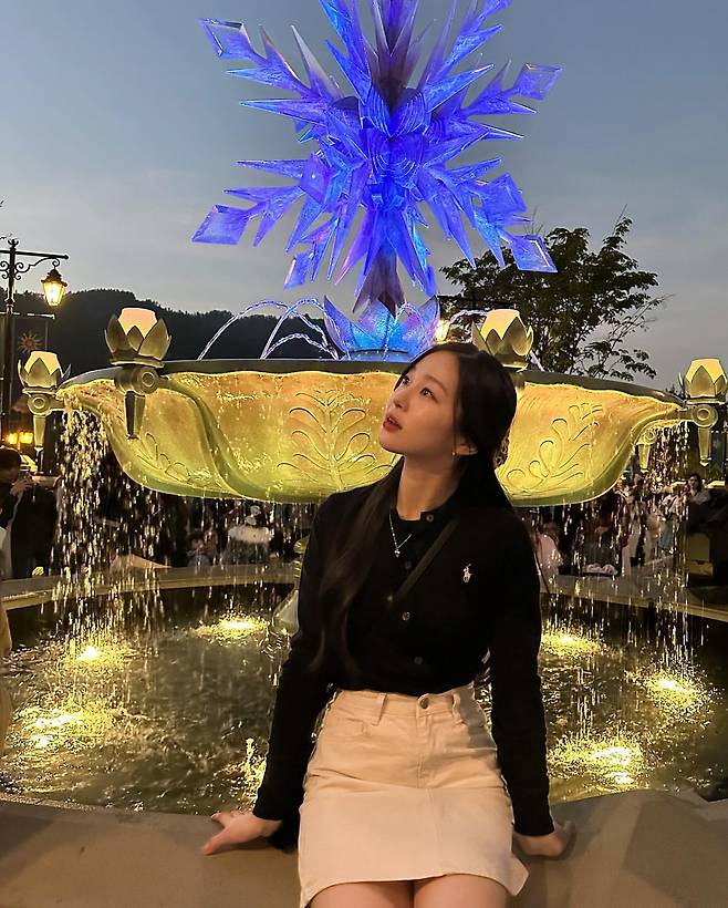 정예서는 화이트 슬리브리스 셔츠와 데님 팬츠로 해변에서 캐주얼한 매력을 연출하고 있다. 단정하게 단추를 채운 크롭 셔츠는 여름철 시원함과 세련됨을 동시에 표현하며, 하이웨이스트 진과의 조화로 깔끔한 실루엣을 완성했다. 녹색 팔찌 하나만으로 포인트를 준 미니멀한 액세서리 연출이 돋보인다.