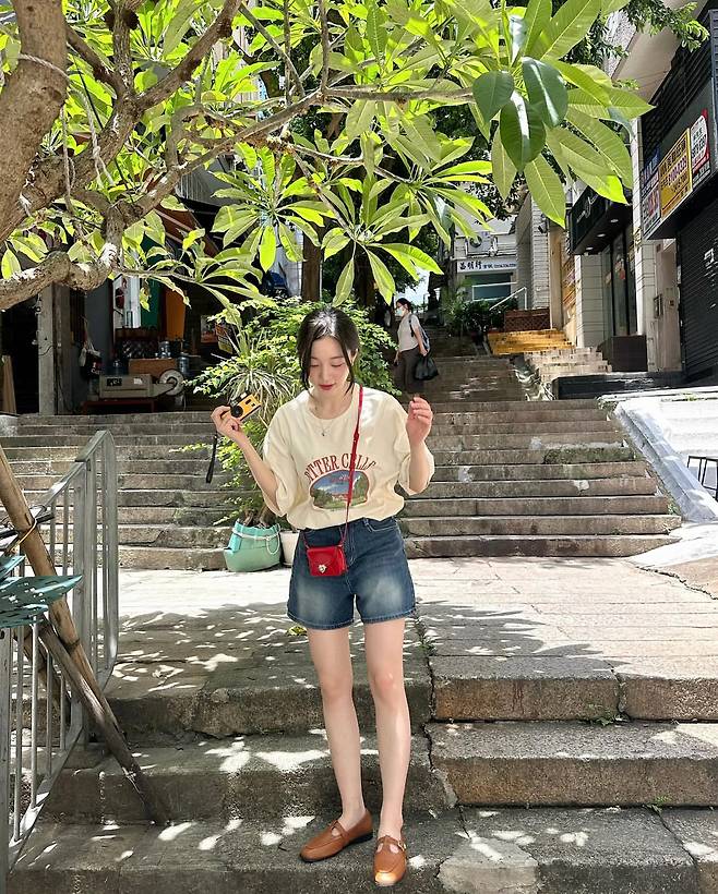 옐로우 그래픽 티셔츠와 데님 쇼츠로 발랄하고 활동적인 여행룩을 완성했다. 빨간색과 초록색 미니백을 포인트로 활용해 컬러풀한 매력을 표현하고 있으며, 브라운 플랫슈즈로 편안함까지 고려한 실용적인 스타일링을 보여주고 있다.