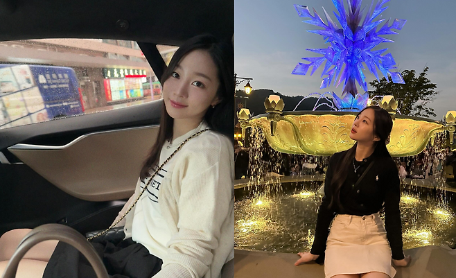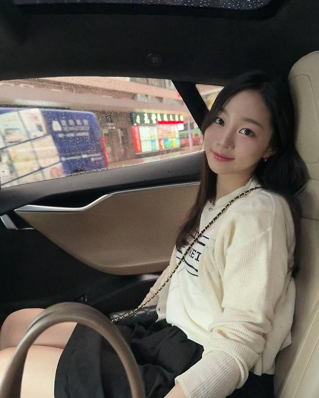 크림색 니트와 블랙 하의로 구성된 편안한 일상복을 착용하고 있다. 체인 크로스백은 실용성과 스타일을 동시에 잡은 아이템으로, 차량 내에서도 자연스럽고 편안한 무드를 연출하고 있다.