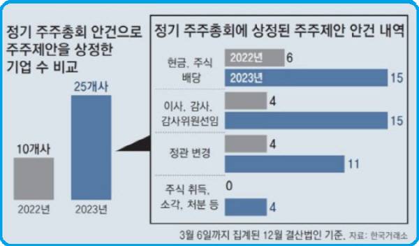 올해 주주총회의 가장 큰 특징은 ‘주주제안’이 그 어느 때보다 활발하다는 것에 있다. 지난 17일 기준으로 볼 때 주주제안이 주주총회 안건으로 채택된 기업이 작년 대비 두 배 가까이 증가했다. 안건별로 보면 현금주식배당을 요구하는 목소리가 25건으로 전년(13건) 대비 두 배가량 늘었고, 이사. 감사를 선임하는 제안이 15건에서 27건으로 늘었다. 지난해 1건에 불과했던 주식 취득, 소각, 처분 제안은 10건으로 급증했다. 정관을 변경하는 제안도 8건에서 17건으로 늘었다.