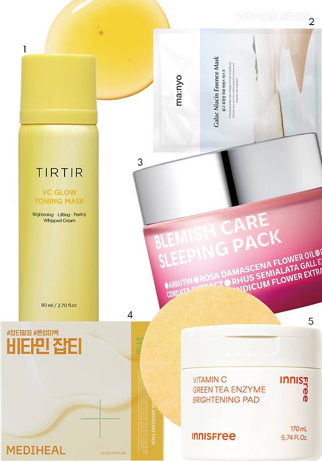 1 티르티르 VC 글로우 토닝 마스크 영국산 비타민 C와 14종의 비타민을 함유한 풍성한 버블이 쫀쫀하고 투명한 광채막을 형성해 피부에 생기를 선사한다. 씻어낼 필요 없는 노워시 버블로 사용이 편리한 것도 장점. 80ml 4만5천원