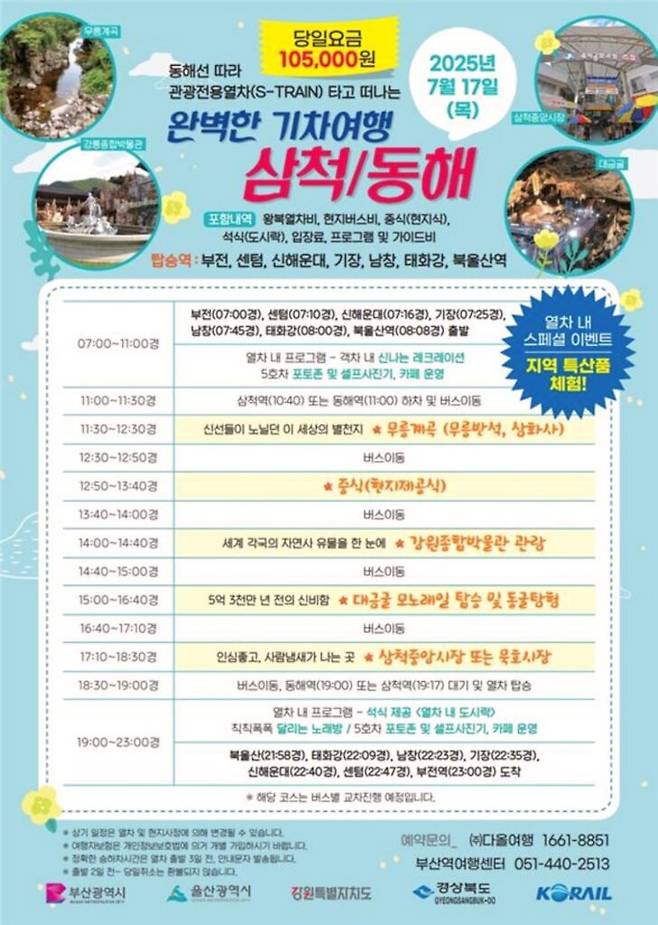 17일 운행되는 부산·울산발 열차는 경북 울진을 경유해 강원 동해와 삼척으로 향한다. 이 열차를 이용하는 관광객들은 삼척역에 도착한 뒤, 삼척 대금굴과 강원종합박물관, 동해 무릉계곡, 묵호시장 등을 둘러보는 일정으로 여행을 이어간다.