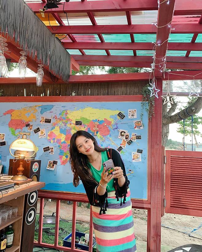 세계 지도가 배경인 카페에서 김지원은 컬러풀한 스트라이프 원피스와 블랙 가디건을 조합해 자유로운 보헤미안 스타일을 연출하고 있다. 그린, 핑크, 옐로우가 어우러진 스트라이프 패턴은 여행의 설렘을 표현하듯 생동감 넘치는 분위기를 자아내며, 편안한 실루엣으로 액티브한 일상에 적합한 룩을 완성하고 있다.