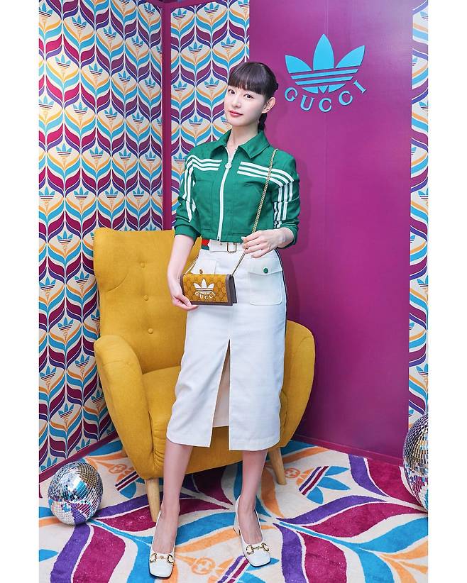 구찌 브랜드 배경 앞에서 김지원은 그린 재킷과 화이트 스커트로 구성된 세트 룩을 연출하고 있다. 재킷의 화이트 스트라이프 디테일이 포인트가 되어 클래식하면서도 모던한 감각을 보여주며, 미디 길이 스커트의 슬릿 디테일이 우아함을 더하고 있다. 체인백과 로퍼로 완성한 토털 룩은 브랜드의 아이덴티티와 완벽하게 어우러지는 하이엔드 스타일링을 선보이고 있다.